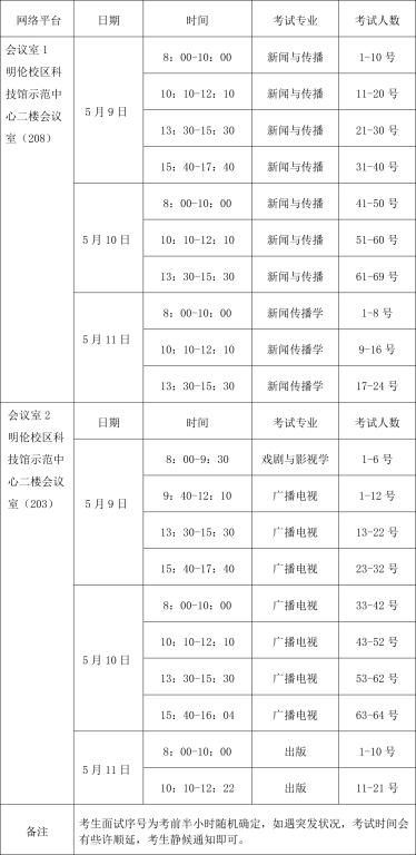 面试正式开始前30分钟完成随机排序,工作人员将在7:30和13:00准时通过WeLink平台发布考生面试时间。收到信息的考生须及时回复并按时接入待考室核验身份备考,在会控工作人员导引下接入面试考场,每位考生只进入一次面试考场,依次完成外语测试、专业知识面试、学术学位复试专业考试(仅限学硕)和同等学力加试(仅限同等学力考生)。各专业将错峰使用网上会议室,原则上学硕面试时间为15分钟/生,专硕面试时间为12分钟/生,具体安排如下: