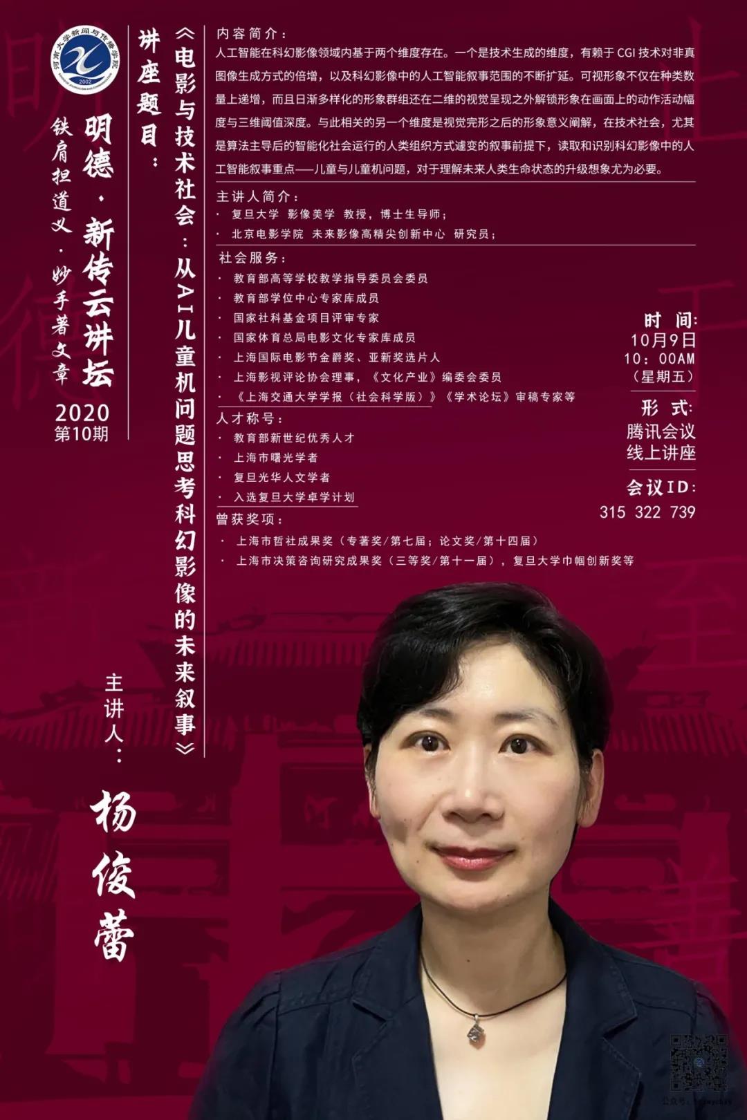 杨俊蕾,复旦大学影像美学教授、博士生导师,北京电影学院未来影像高精尖创新中心研究员,担任教育部高等学校教学指导委员会委员,教育部学位中心专家库成员,国家社科基金项目评审专家,国家体育总局电影文化专家库成员,上海国际电影节金爵奖、亚新奖选片人,上海影视评论协会理事、《文化产业》编委会委员,《上海交通大学学报(社会科学版)》《学术论坛》审稿专家等。获得“教育部新世纪优秀人才”、“上海市曙光学者”、“复旦光华人文学者”等称号,并入选复旦大学卓学计划。曾获上海市哲社成果奖第七届专著奖和第十四届论文奖、上海市决策咨询研究成果奖第十一届三等奖、复旦大学巾帼创新奖等奖项。